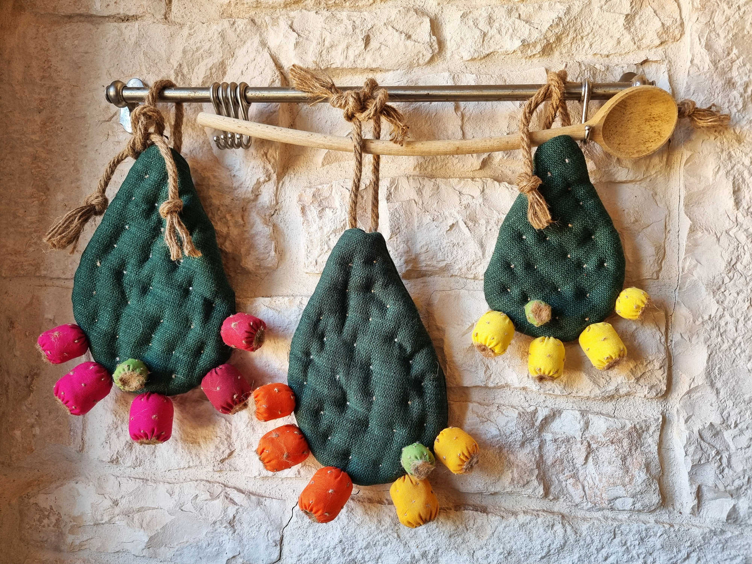 Ogni pala è realizzata a mano, cucita, imbottita e impunturata con cura in yuta naturale. I frutti, realizzati con una gradazione cromatica che simula le diverse fasi di maturazione, sono sorprendentemente realistici, sia alla vista che al tatto.
